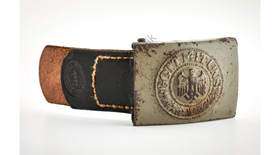 Eredeti, 1940 mintájú német szárazföldi haderő (Heer) derékszíjcsat, préselt acélból, jellegzetes, zöld festéssel. A csat elülső felülete sima, középen domborított, nagy részletességgel kidolgozott Wehrmacht-sassal, mely leeresztett szárnyakkal ábrázolt, karmában szvasztikával. A madár alatti félkörben babérkoszorú fut, felette a „GOTT MIT UNS” (Velünk az Isten) felirat olvasható, melyet finom bordázott háttér és dupla, sodrott kötélmintás keret vesz körül.